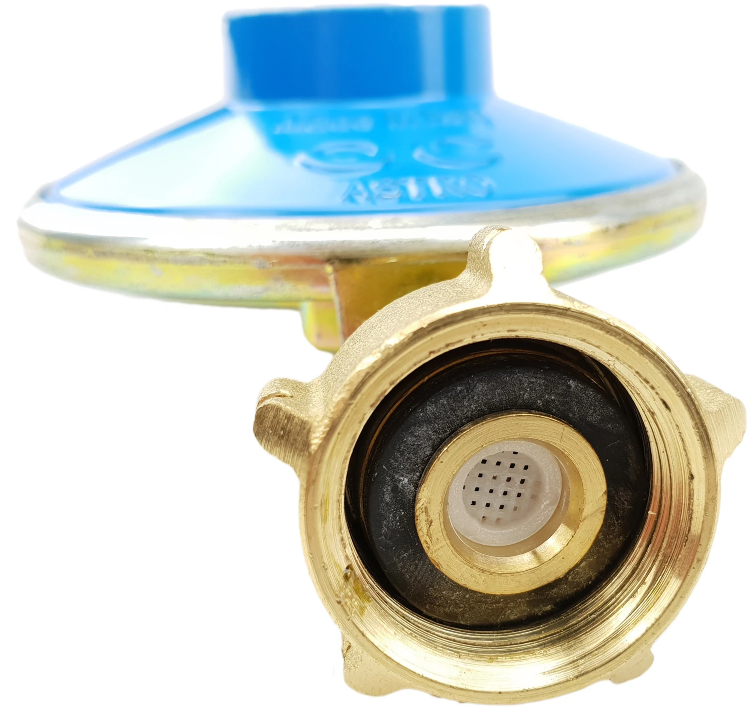 Der Druckminderer lässt sich auf Schweizer Gasflaschen schrauben und regelt den Druck auf den in Deutschland gebräuchlichen Arbeitsdruck von 50 mbar herunter.