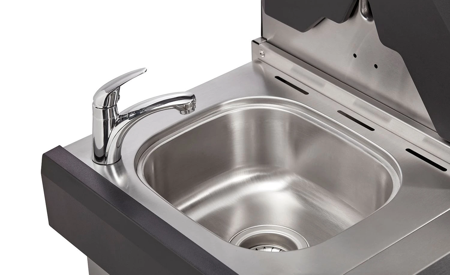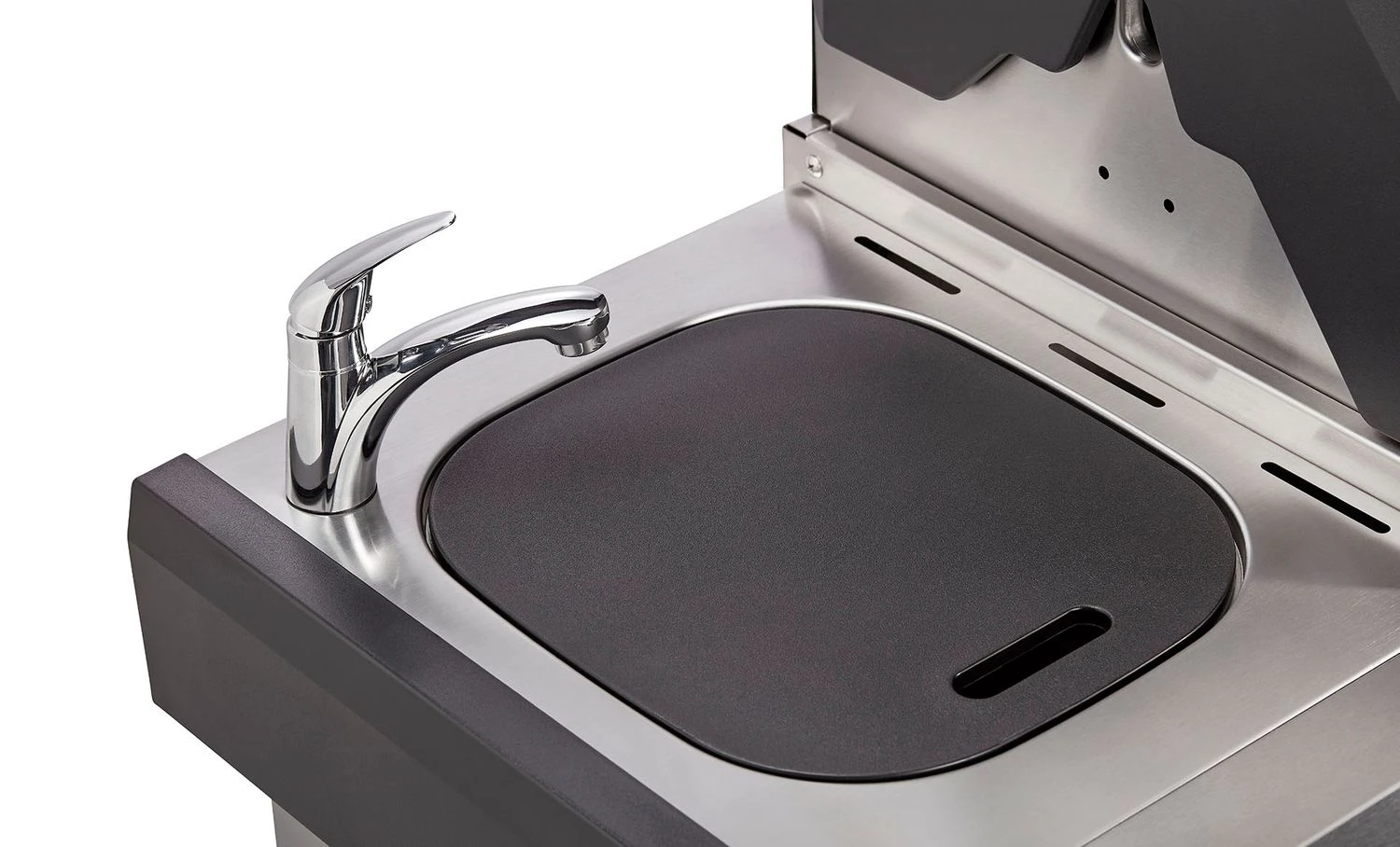 In einer vollumfänglichen Outdoorküche darf ein Spülbecken auf keinen Fall fehlen! Das in der linken Seitenablage integrierte Spülbecken aus Edelstahl spart die Wege nach drinnen zur Einbauküche. Mal eben schnell die Hände säubern, die Grillzange abspülen oder den Salat waschen: Mit dem Enders Kansas II Pro 4 kein Problem.