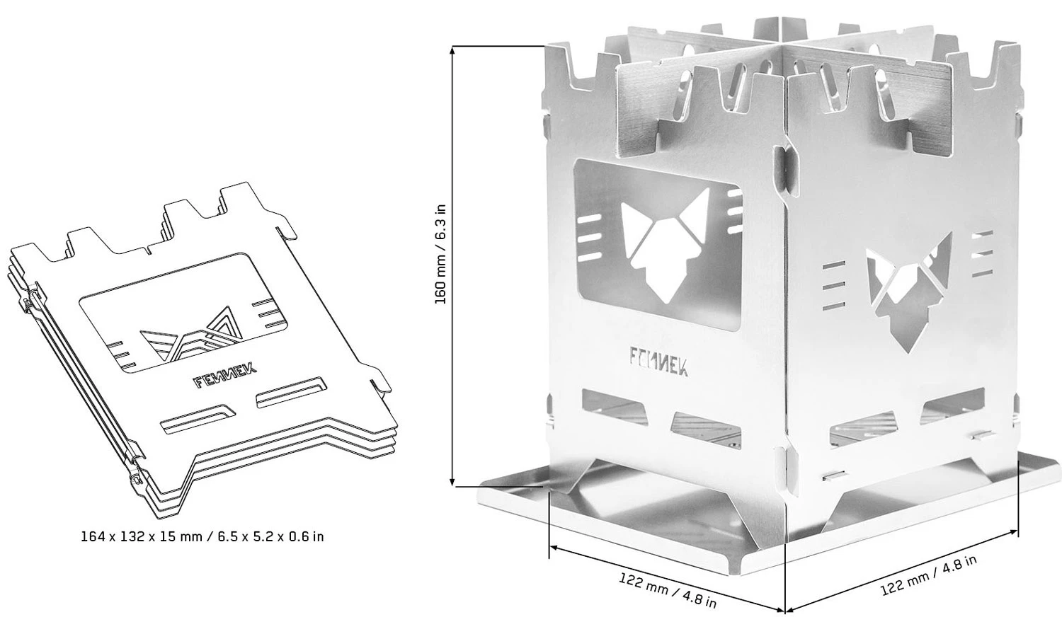 Dank des ausgeklügeltes Klappsystems lässt sich der Fennek Premium Hobo Kocher besonders schnell und einfach auf- und abbauen. Die 4 Seitenteile sind mit Scharnieren verbunden. Am Ende werden die Teile mit nach oben und unten gerichtete Hacken verkeilt. Das sorgt für einen stabilen und sicheren Halt, selbst wenn der Kocher bewegt wird. Zur Reinigung kann das Gehäuse komplett flach aufgeklappt werden.