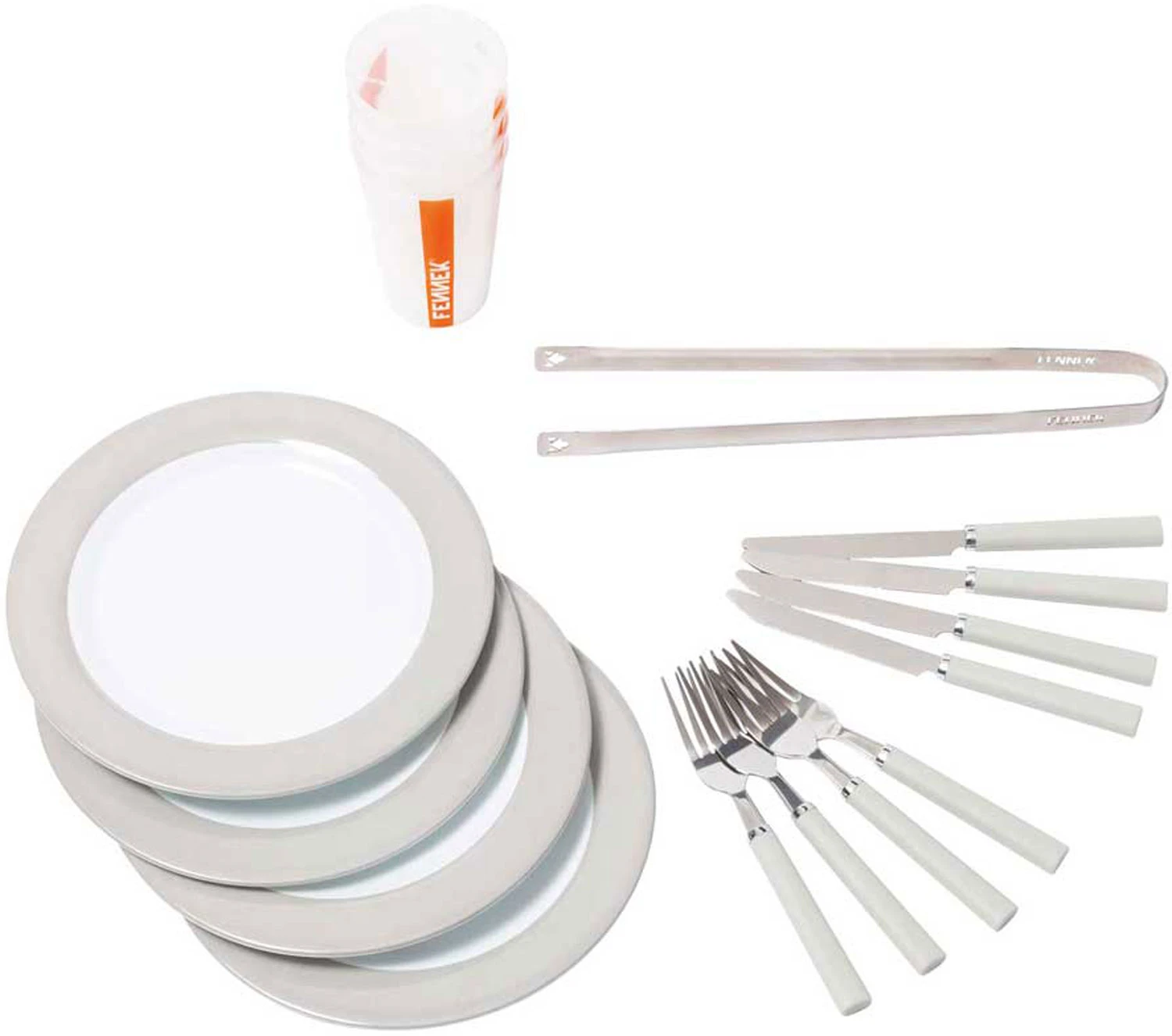 Ideal befinden sich im vorderen Teil des Rucksacks eine komplette Besteckausrüstung für 4 Personen. Dazu gehören strapazierfähige Telle, Trinkbecher, Messer und Gabeln sowie die hochwertige Fennek Grillzange aus Edelstahl, damit die Würstchen unterwegs auch gleich sicher und einfach gewendet werden können.
