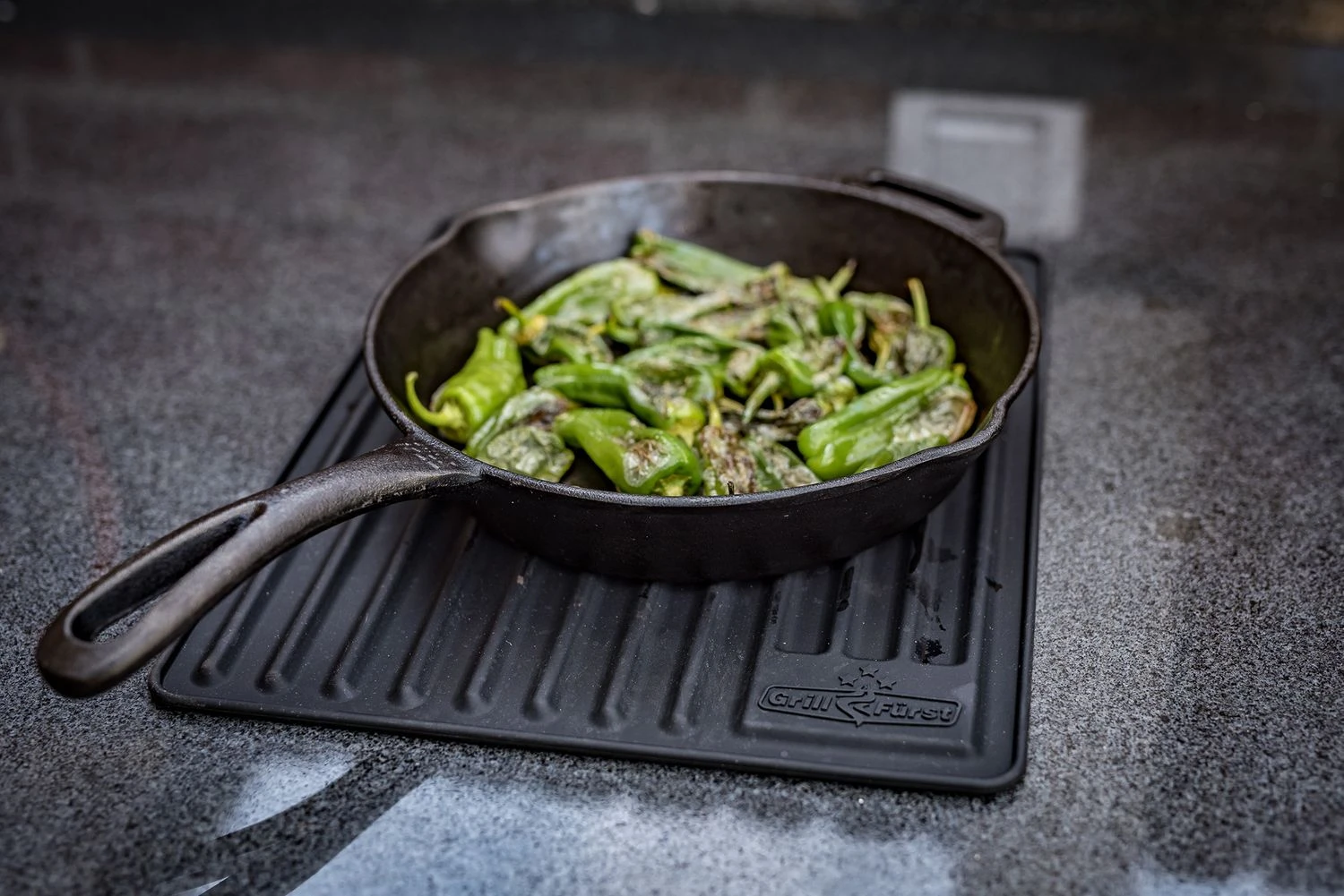 Kleine Beilagen vom Grill, wie z.B. Pimientos de Padrón, werden gerne in Gusspfannen zubereitet und können dank Unterleger somit direkt am Esstisch serviert werden.