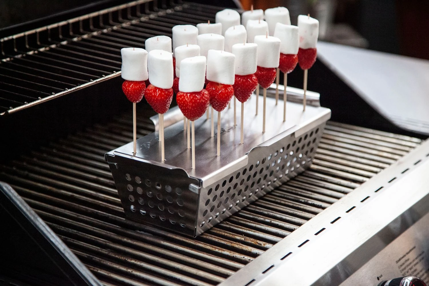 Mit der Kombination aus Edelstahl Gemüsekorb und Spießhalter erhalten Sie die Möglichkeit der einfachen Zubereitung von beliebten Leckereien: