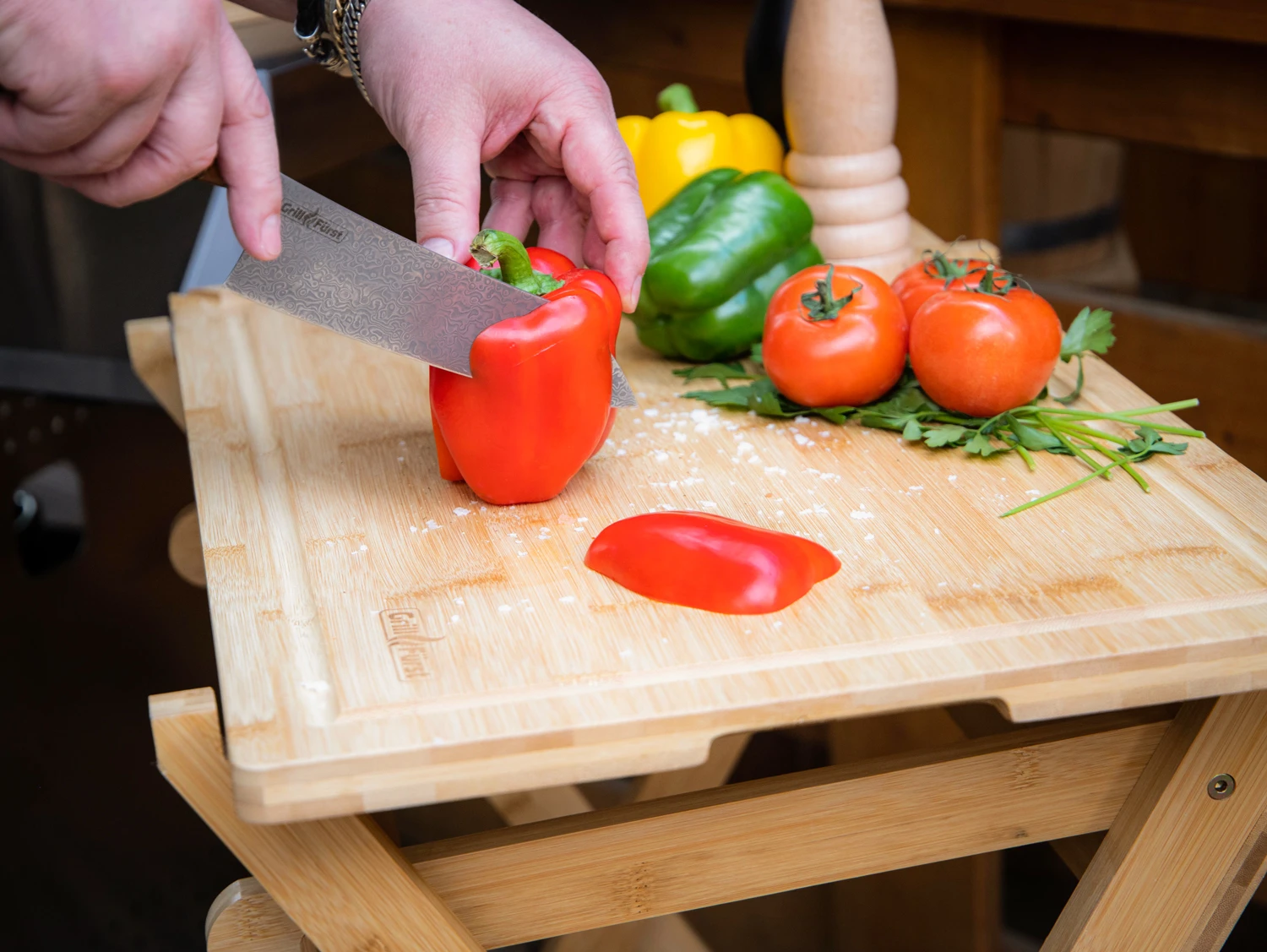 Der Grilltisch ist mit einem massivem abnehmbaren Bambus Schneidebrett ausgestattet, so dass Fleisch z.B. direkt tranchiert und samt Schneidbrett serviert werden kann. Wird er nicht benötigt kann der Klapptisch ganz einfach und platzsparend verstaut werden.