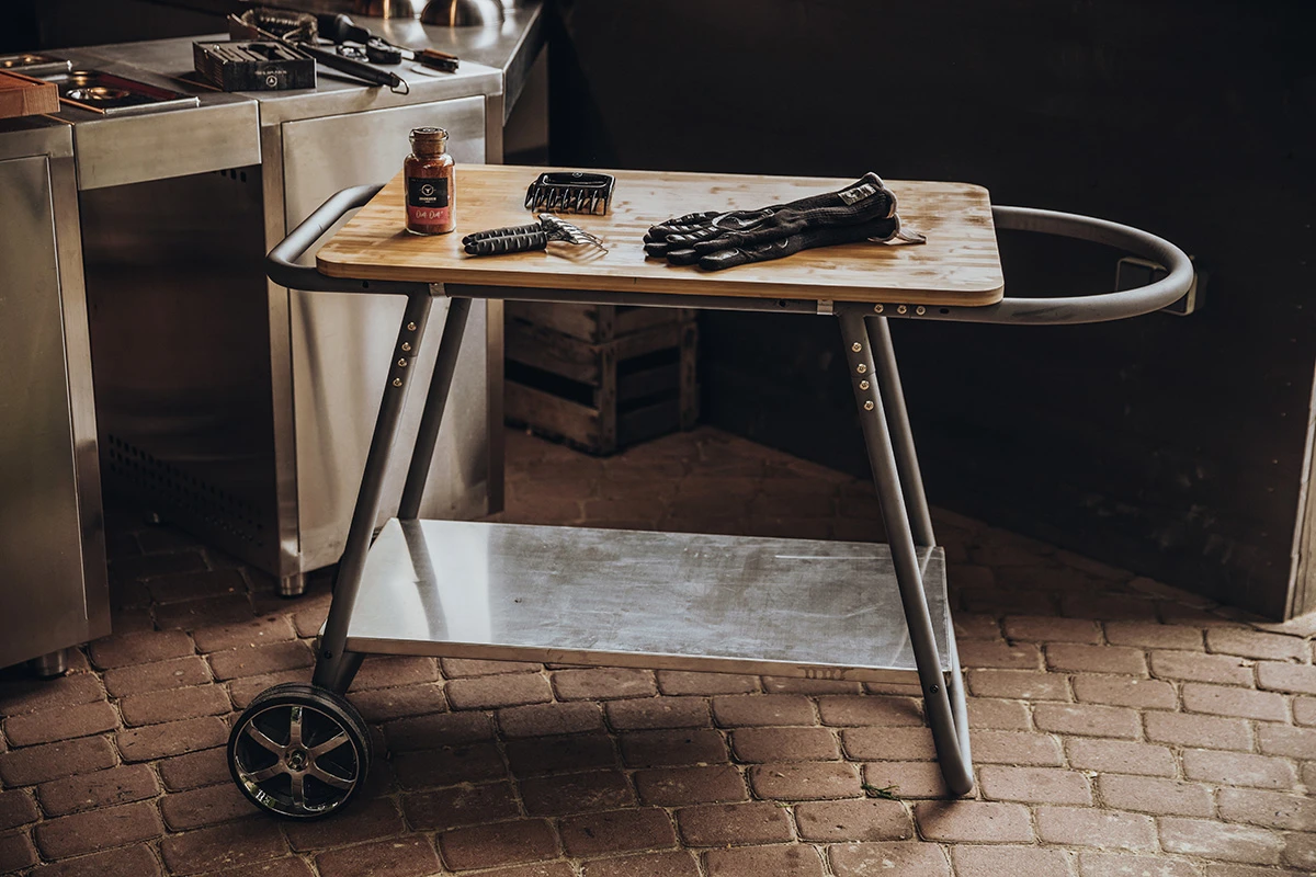 Das matt-graue Rahmengestell gleicht dem Unterbau des Pelletgrills „Sheriff“ von Moesta. In Kombination mit dem Beistelltisch ergibt sich ein einheitliches Bild für Ihre Outdoorküche.