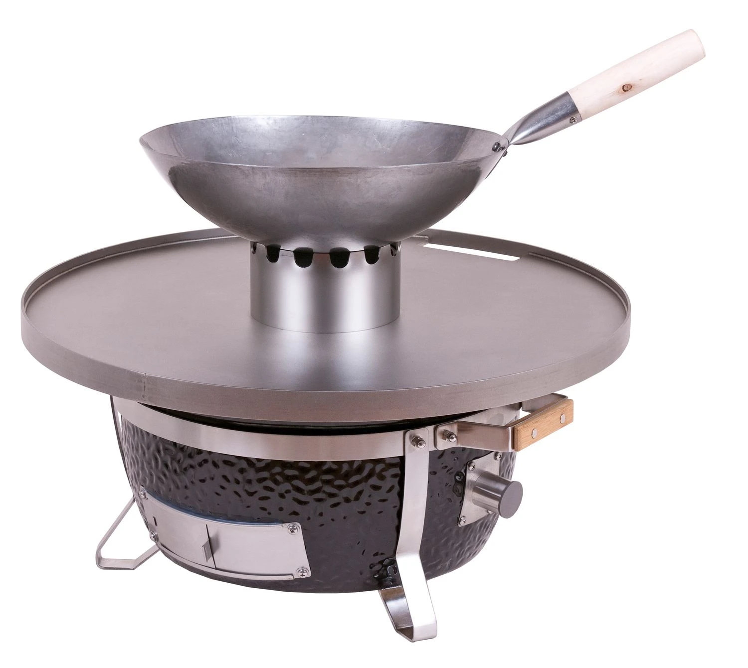 Die Wok-Krone aus Edelstahl wird einfach in der Mitte einer Monolith Feuerplatte aufgesteckt und dient der Verwendung eines Woks auf ihrem Monolith Keramikgrill.