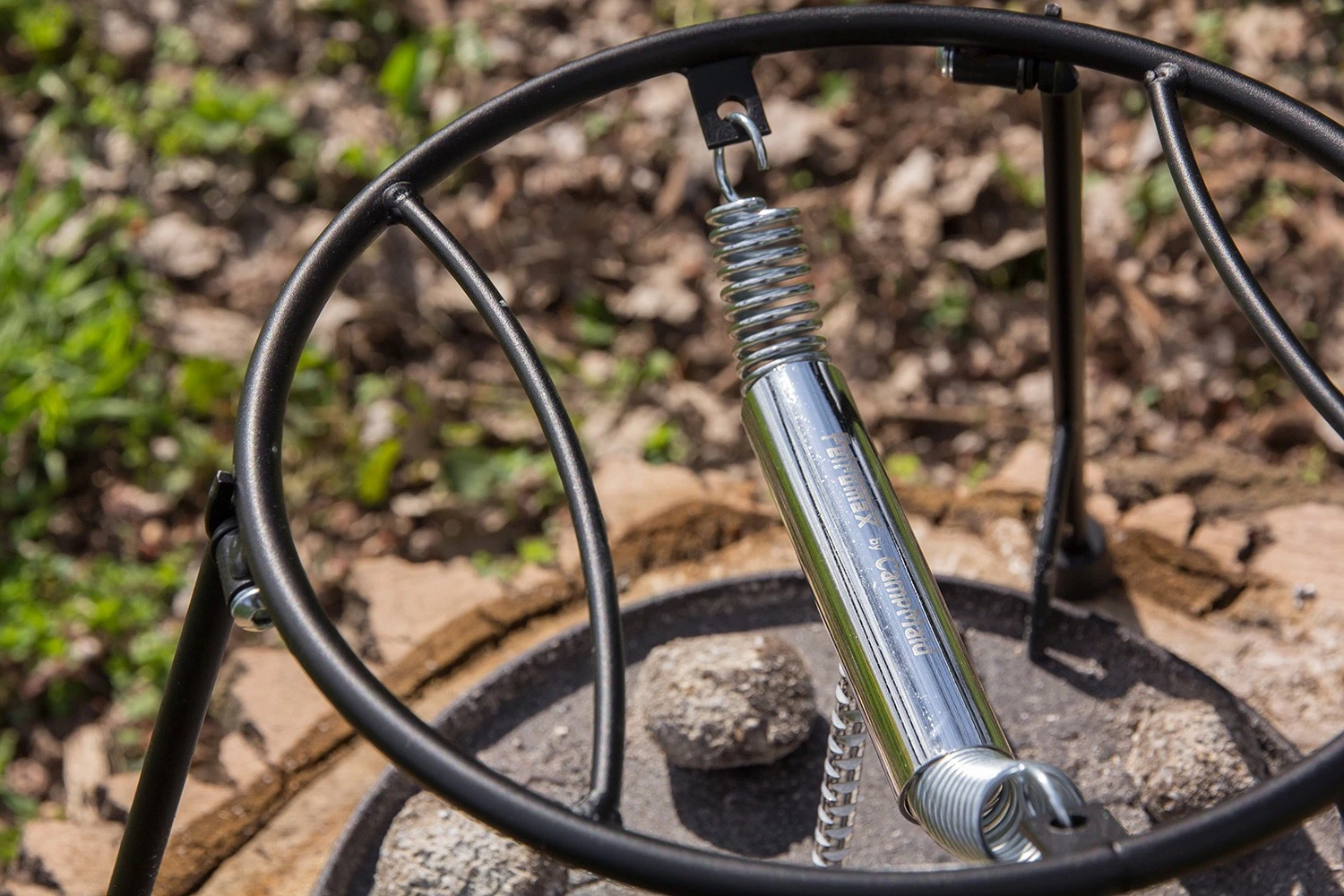 Mit dem Petromax Deckelhalter ist das Anheben des heißen Dutch Oven Deckels ganz einfach, selbst dann, wenn glühende Kohlen oben auf dem Deckel liegen. So haben Sie den massiven Gussdeckel jederzeit im Griff. Drücken Sie einfach die Feder des Deckelhalters herunter und haken Sie ihn in die Öse des Deckels ein. Schon sitzt der Deckel sicher im Halter.
