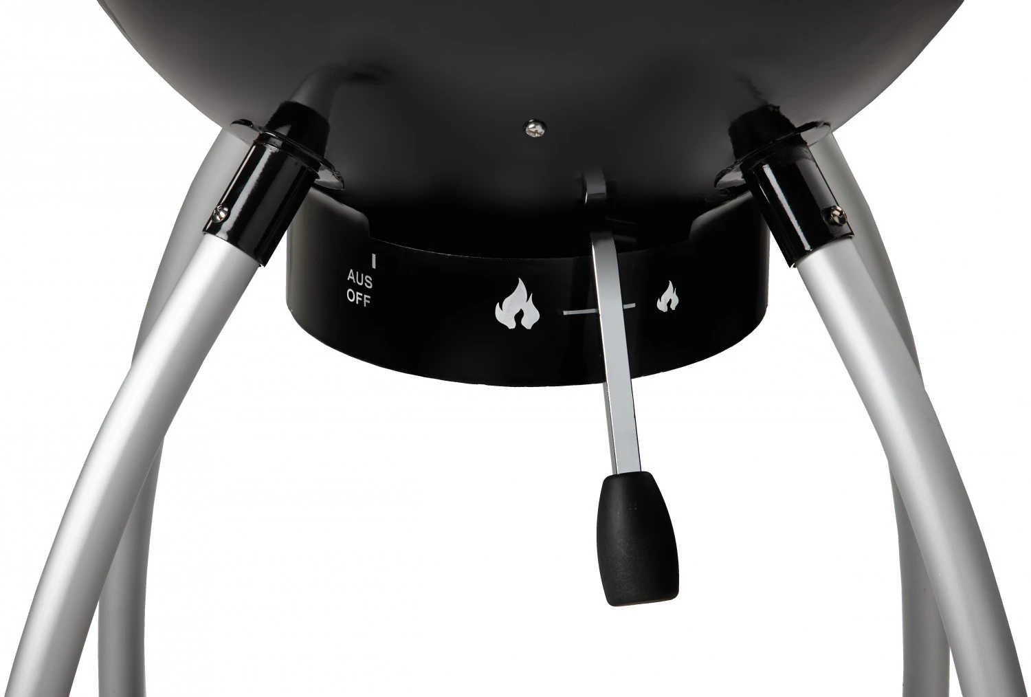 Die Grillkugel sitzt auf einem stabilen Rohrrahmen aus Aluminium und gibt dem Grill einen stabilen Stand. An zwei der Beinen sind Räder montiert, die einen einfachen Transport des Holzkohlegrills versprechen. Zwischen den Beinen des Gestelles ist für die gute Stabilität noch eine Ablage eingebaut. Hier können Sie auch Grillzubehör verstauen.