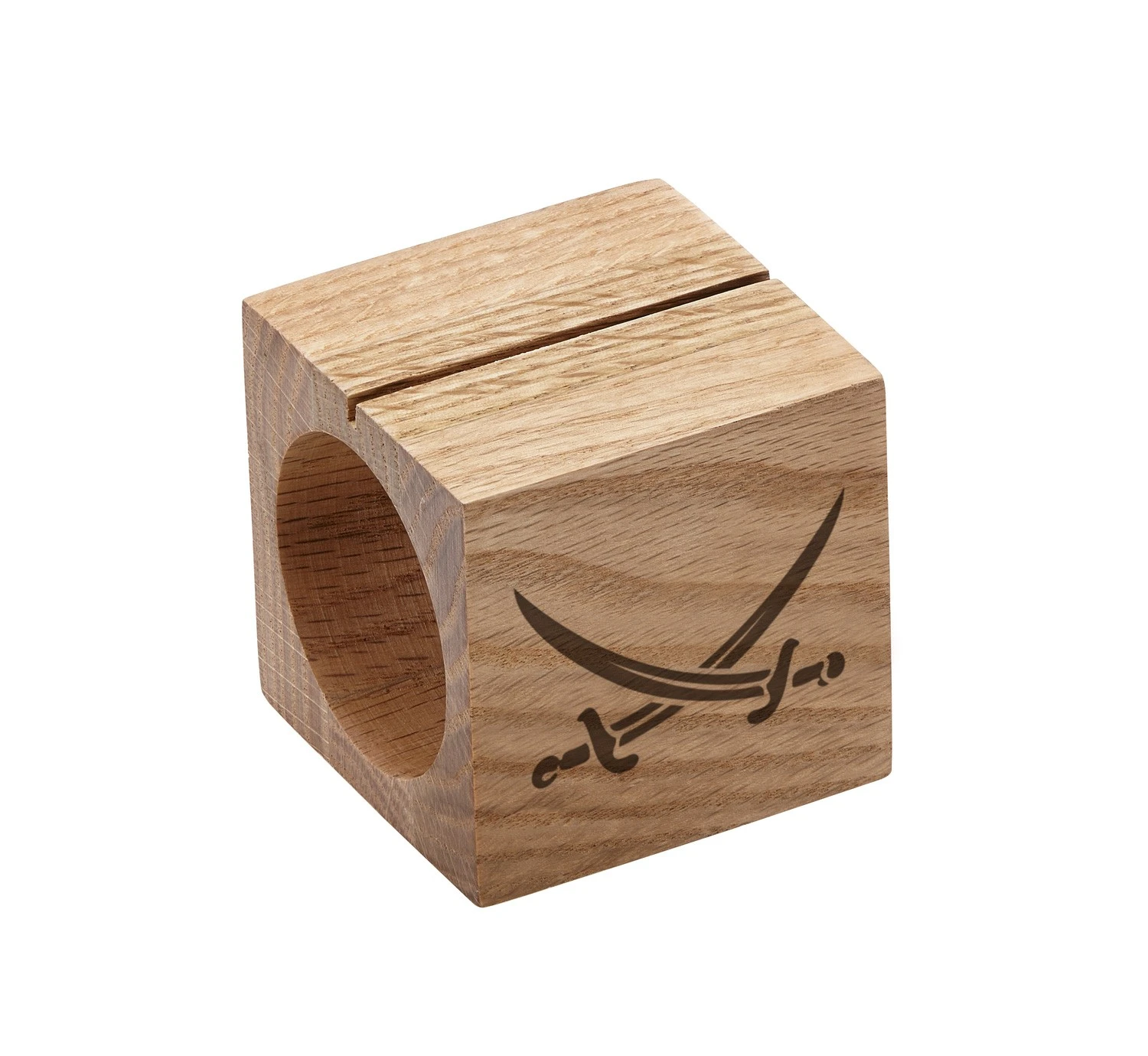 Die etwa 6 x 6 x 6 cm großen Serviettenringe besitzen in der Mitte eine große Bohrung, welche die gerollte Serviette aufnimmt. Auf der Oberseite der Serviettenringe befindet sich eine Nut, um eine Platzkarte oder eine Nachricht an den Gast befestigen zu können.
