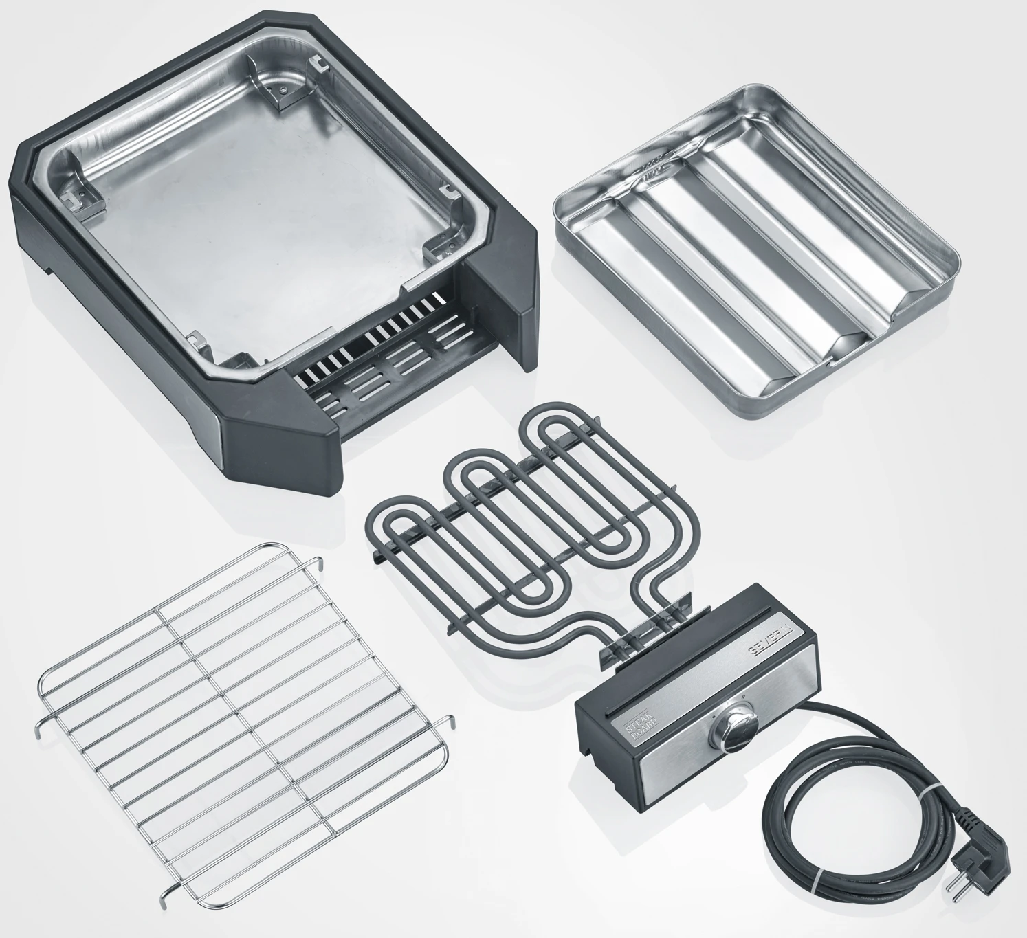 Kernstück des Steakboards ist die doppelte Heizspirale mit 2.300 Watt Leistung, die zusammen mit der Reflektorschale Temperaturen bis zu 500 °C ermöglicht. Bei Leistungsstufe 1 wird nur eine Heizspirale genutzt, sodass das Fleisch bei niedrigen Temperaturen nachziehen kann.