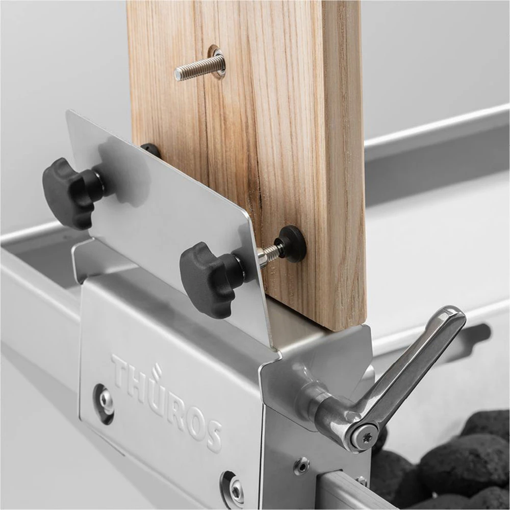 - 2 Edelstahl-Halter für Holzspieße und Flammlachsbrett mit Stellgriffschraube zur stufenlosen Einstellung des Neigungswinkels