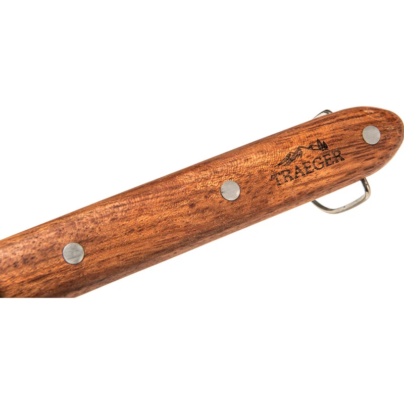 Edel im Griff aus Rosenholz eingearbeitet, ist das Traeger Logo auch bei diesem praktischen Zubehör aus dem Traeger Sortiment zu finden.